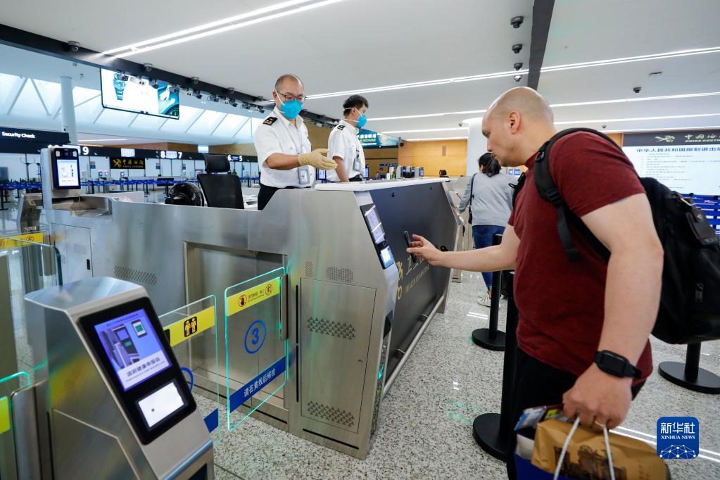 6月21日,在成都天府国际机场,成都海关关员(左)指导一名外国旅客刷健康申报码通过多功能一体化智能闸机。