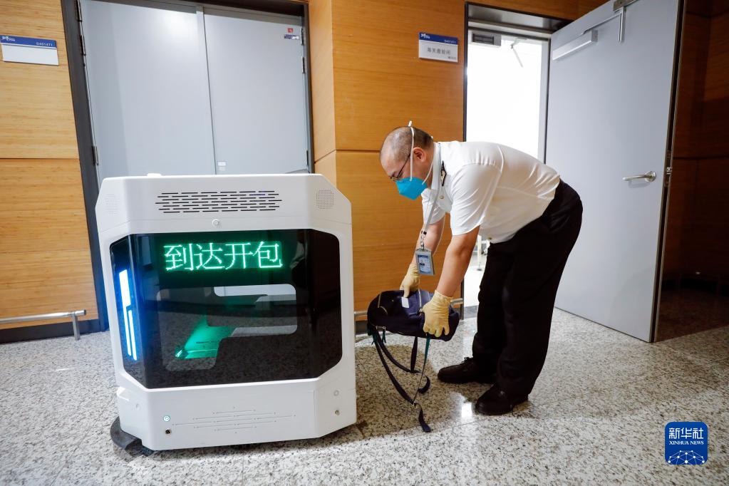 6月21日,在成都天府国际机场,成都海关关员从手提行李智能携运机器人中取出异常行李,准备开包检查。