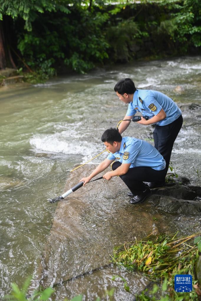 6月25日,杭州市生态环境局临安分局的工作人员在位于临安区的杭州亚运会场馆周边进行溪水取样。