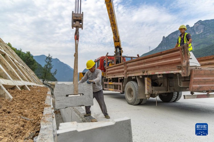 6月27日,在巫镇高速公路二标段施工现场,施工人员在搬卸排水沟盖板。 新华社记者 黄伟 摄
