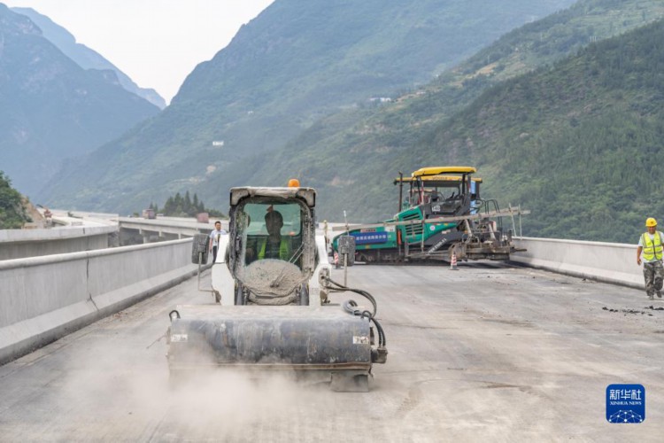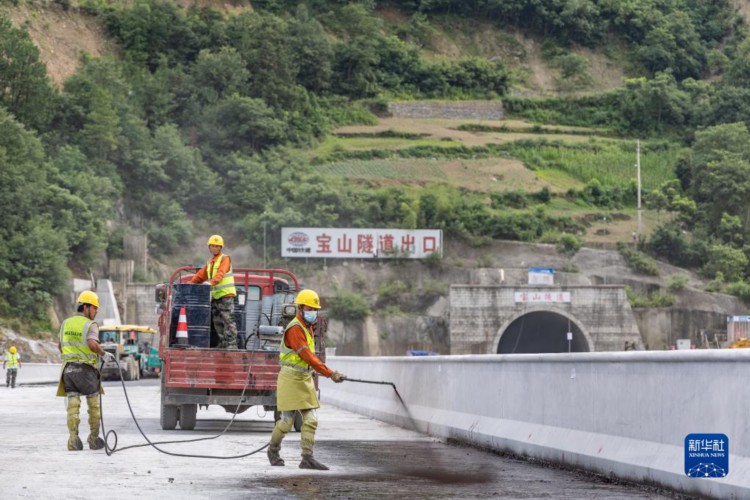 6月27日,在巫镇高速公路二标段施工现场,施工人员在进行桥面防水施工。 新华社记者 黄伟 摄