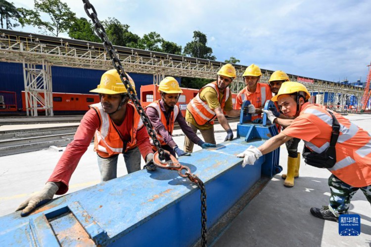 6月28日,在位于马来西亚彭亨州的马东铁项目云顶隧道施工现场附近,几名工人合力作业。 马来西亚东海岸铁路(马东铁)是中马共建“一带一路”的标志性项目。位于马来西亚彭亨州的云顶隧道处于项目腹地,单条隧道全长16.39公里,是马东铁项目的控制性工程。新华社记者 程一恒 摄 |