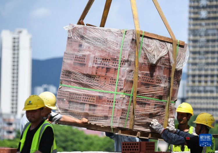 6月29日,在中建三局承建的西安电子科技大学广州研究院项目工地,工人在协助吊装材料。