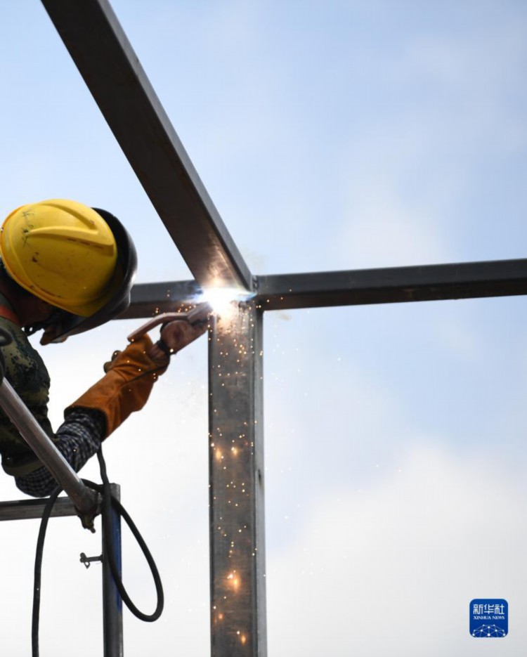 6月29日,在中建三局承建的西安电子科技大学广州研究院项目工地,工人进行焊接作业。