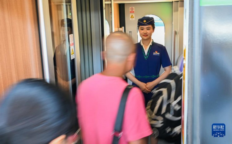 6月29日,在呼和浩特东站,呼和浩特客运段西宁车队动车组乘务员在列车上迎接旅客。 暑运临近,中铁呼和浩特局集团有限公司呼和浩特客运段全面提升列车服务质量,完善优化列车乘务员的服务举措和服务内容,让旅客出行更加舒适。 新华社记者 刘磊 摄 |
