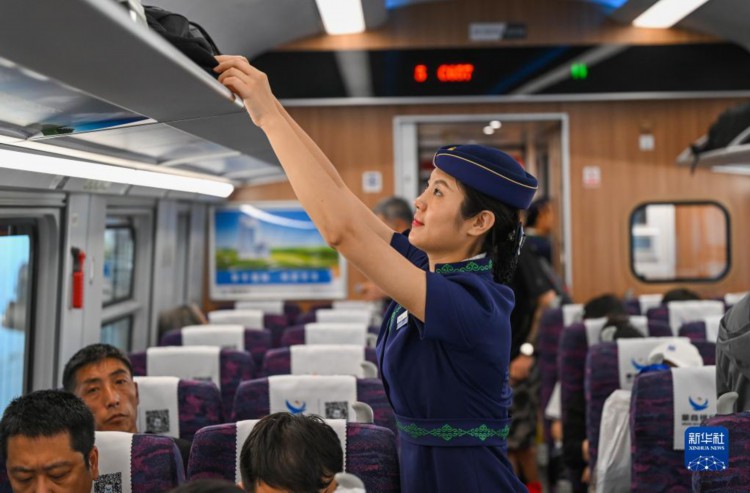 6月29日,呼和浩特客运段西宁车队动车组乘务员在列车上整理行李架。 暑运临近,中铁呼和浩特局集团有限公司呼和浩特客运段全面提升列车服务质量,完善优化列车乘务员的服务举措和服务内容,让旅客出行更加舒适。 新华社记者 刘磊 摄