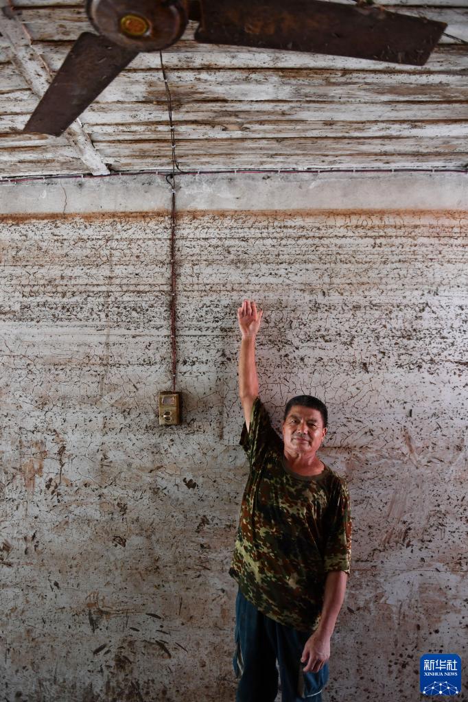 7月2日,在湖南省湘西土家族苗族自治州古丈县岩头寨镇草潭村,村民指出洪水在家中留下的痕迹。 6月29日以来,湖南省湘西土家族苗族自治州遭遇今年入汛以来最强降雨过程,湘西州的古丈、保靖、永顺三个县不同程度受灾。目前洪水逐渐消退,受灾地区正组织干部群众抢险救灾,努力保障受灾群众基本生活需求。 新华社记者 陈振海 摄
