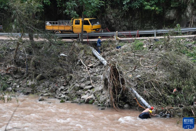 7月2日,工人在湖南省湘西土家族苗族自治州古丈县岩头寨镇草潭村抢修电力设施。 6月29日以来,湖南省湘西土家族苗族自治州遭遇今年入汛以来最强降雨过程,湘西州的古丈、保靖、永顺三个县不同程度受灾。目前洪水逐渐消退,受灾地区正组织干部群众抢险救灾,努力保障受灾群众基本生活需求。 新华社记者 陈振海 摄