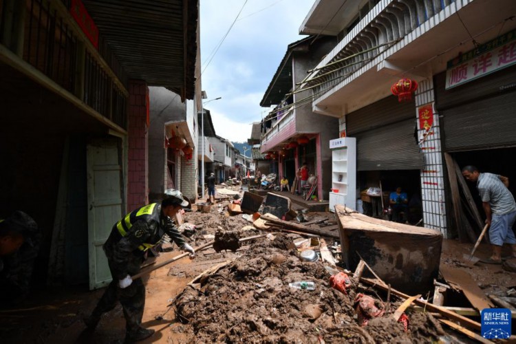 7月2日,在湖南省湘西土家族苗族自治州古丈县岩头寨镇草潭村,当地应急民兵协助村民清理淤泥和垃圾。 6月29日以来,湖南省湘西土家族苗族自治州遭遇今年入汛以来最强降雨过程,湘西州的古丈、保靖、永顺三个县不同程度受灾。目前洪水逐渐消退,受灾地区正组织干部群众抢险救灾,努力保障受灾群众基本生活需求。 新华社记者 陈振海 摄