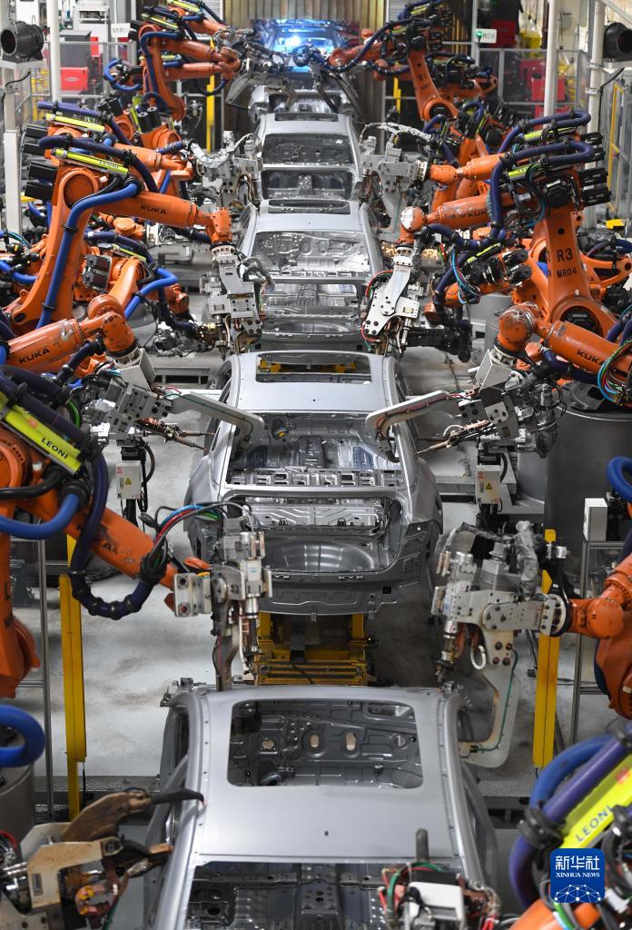 这是7月3日拍摄的广州广汽埃安第一智造中心新能源汽车焊装车间。