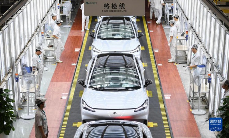 这是7月3日拍摄的广州广汽埃安第一智造中心新能源汽车总装车间的终检线。