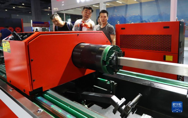 7月5日,展方工作人员(中)向参观者介绍一台光纤激光切管机。 当日,2023上海国际机床展在国家会展中心(上海)拉开帷幕。本届展会设置金属切削机床、金属成形机床、磨削工量具、机床附件、智能工业、新能源装备6大主题展区,约1500家国内外品牌集中展示行业内新锐产品。 新华社记者 方喆 摄