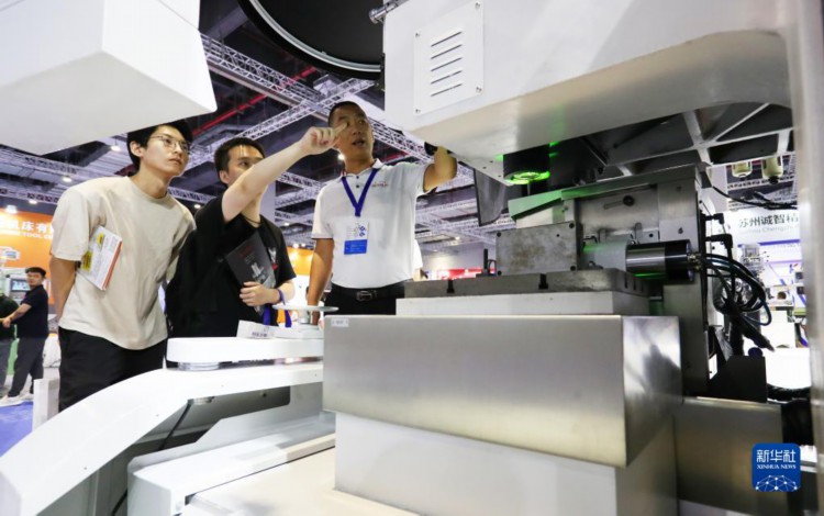 7月5日,参观者在一台进行作业演示的三坐标测量机前驻足观看。 当日,2023上海国际机床展在国家会展中心(上海)拉开帷幕。本届展会设置金属切削机床、金属成形机床、磨削工量具、机床附件、智能工业、新能源装备6大主题展区,约1500家国内外品牌集中展示行业内新锐产品。 新华社记者 方喆 摄