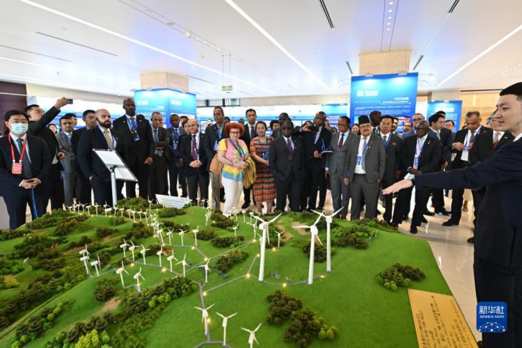 7月6日,驻华使节在国机集团国际化经营成果展厅内参观由该集团承建的肯尼亚基佩托风电项目沙盘。 新华社记者 李鑫 摄 |