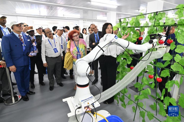 7月6日,驻华使节在国机集团中国农机院观看番茄采摘机器人作业演示。