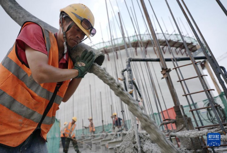 7月8日,工人在粮食安全应急储备及食品深加工全链化综合生产基地项目建设工地施工。