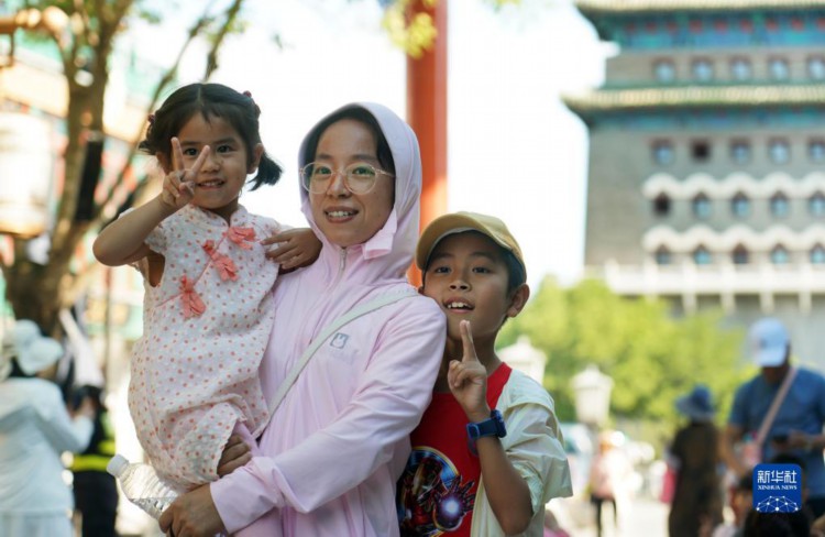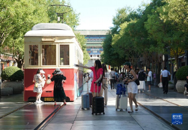 7月9日,人们在前门大街拍照留念。 时值周末,许多市民和游人来到北京天安门广场、前门大街等景点参观游览,乐享暑期。 新华社记者 任超 摄