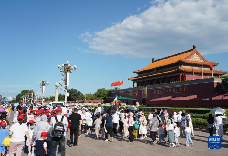 7月9日,人们在天安门广场参观游览。 时值周末,许多市民和游人来到北京天安门广场、前门大街等景点参观游览,乐享暑期。 新华社记者 任超 摄