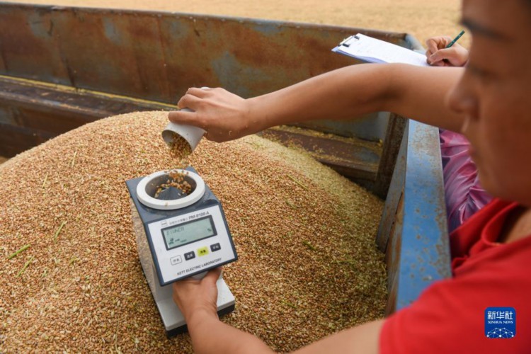 7月10日,在石嘴山市平罗县姚伏镇,农业工作者对小麦进行水分测量。