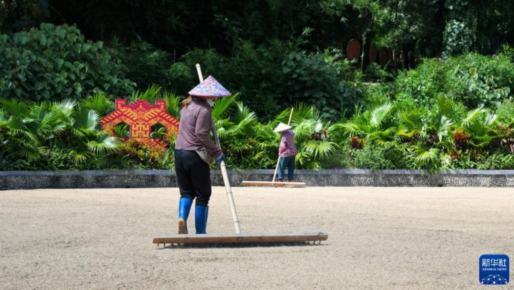 7月10日,毛纳村村民在广场上晾晒稻谷。 三伏将至,海南省五指山市水满乡毛纳村村民抢抓农时晾晒稻谷,田间地头一派繁忙。 新华社记者 杨冠宇 摄