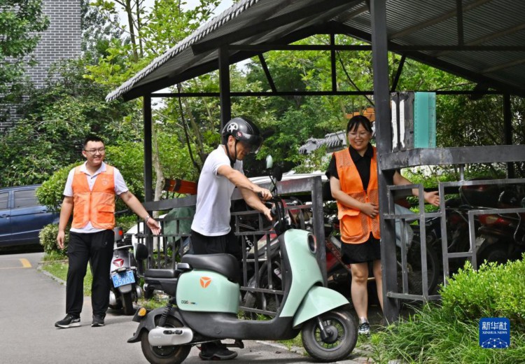 7月11日,青岛胶州市少海澜山小区工作人员引导居民将电动自行车停进集中充电点。