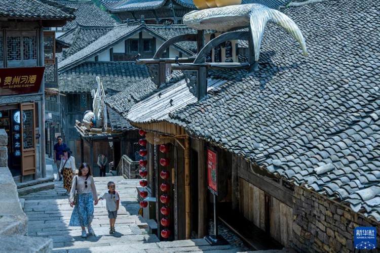 7月11日,游客在贵州省遵义市播州区乌江寨景区游览。