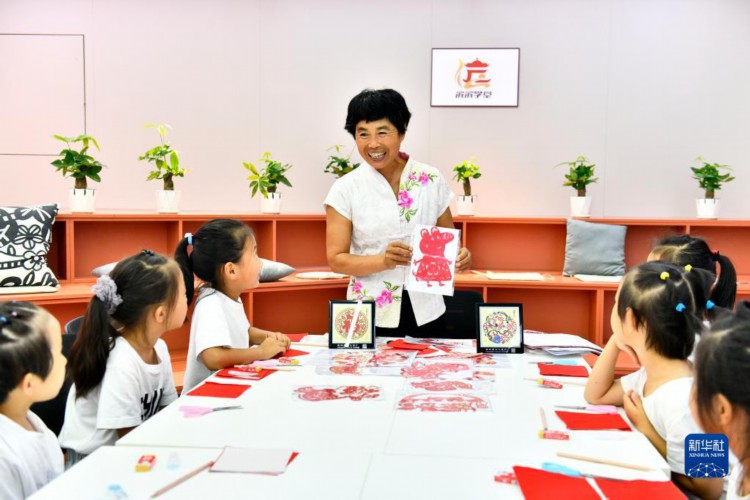 7月13日,在惠民县姜楼镇一处“滨滨学堂”,公益讲师张士翠教孩子们剪纸。