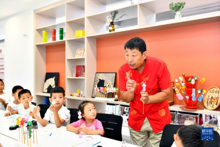 7月13日,在惠民县姜楼镇一处“滨滨学堂”,公益讲师刘延贵教孩子们面塑知识。