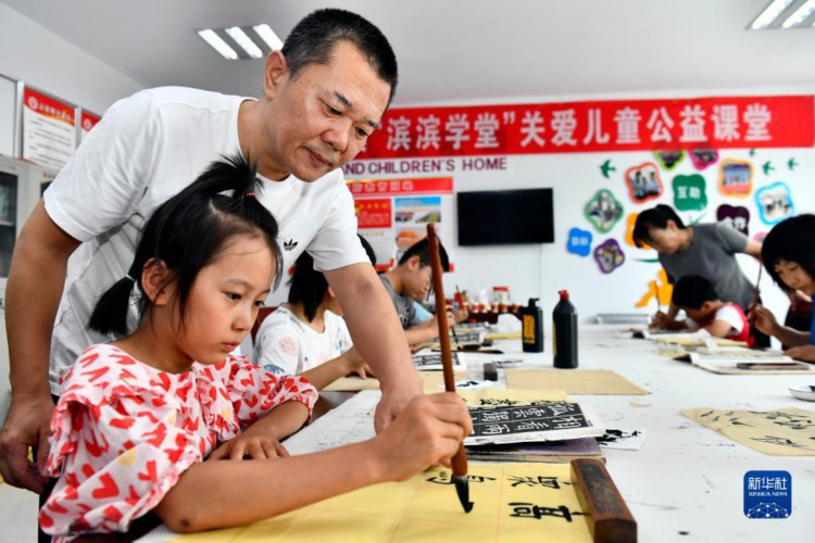 7月13日,在惠民县胡集镇一处“滨滨学堂”,公益讲师常春辉教孩子们练习书法。