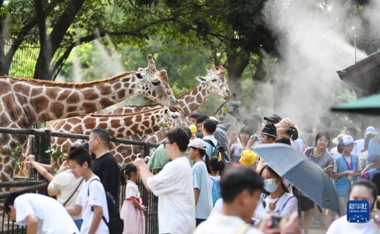 7月13日,广州动物园采用降温喷雾给长颈鹿避暑。