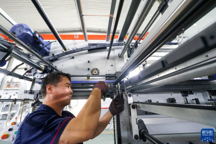 7月13日,河北省玉田县一家印刷包装机械制造企业的工人在调试产品。
