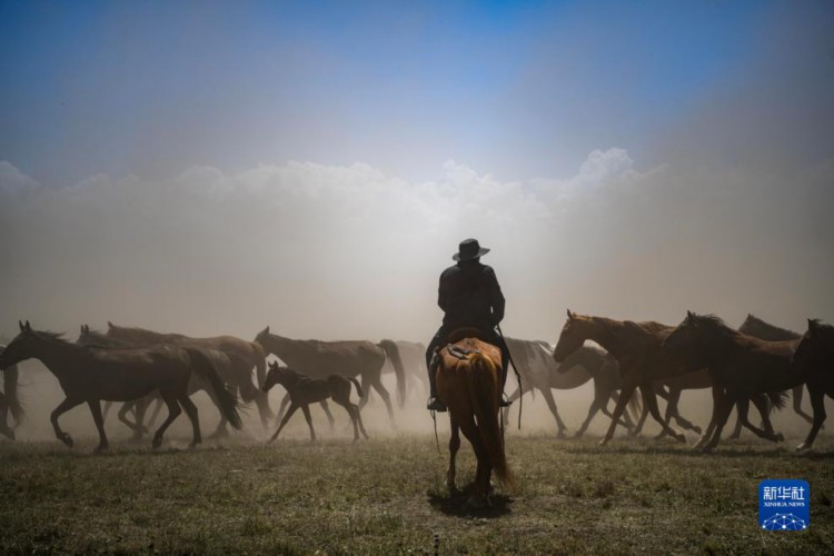 7月16日,牧民在昭苏县天马旅游文化园的草原上遛马。