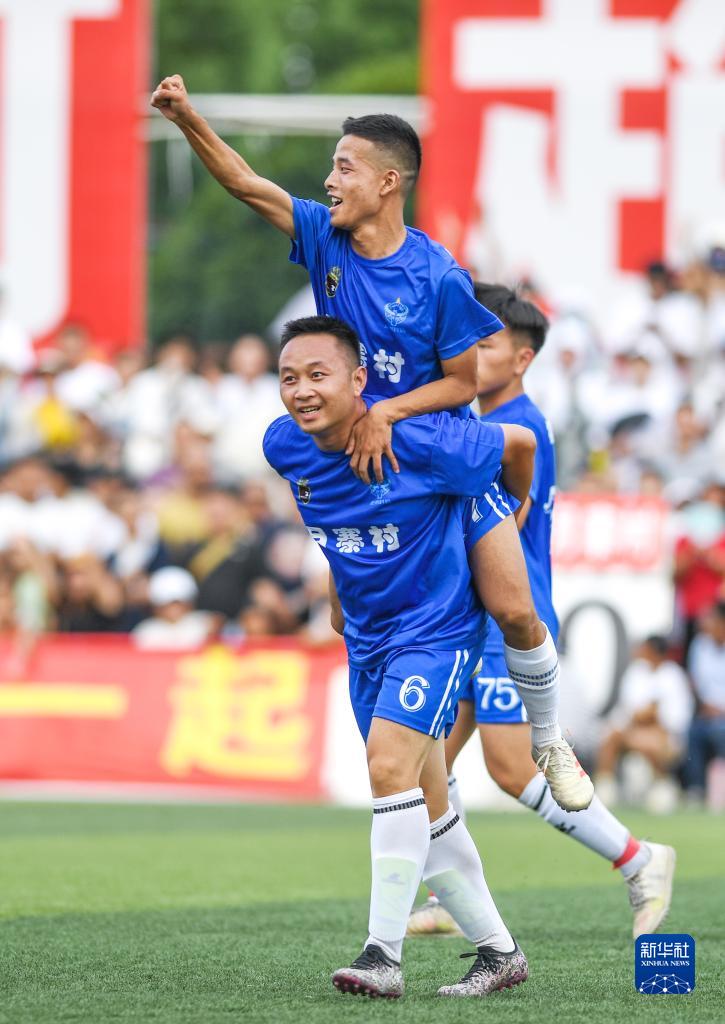 7月15日,月寨村足球队球员李远攀(前)与队友在庆祝进球。