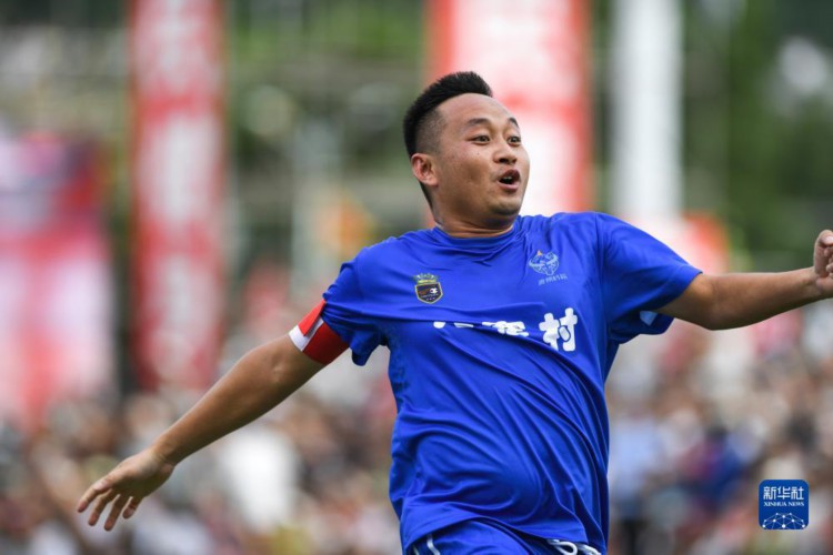 7月15日,月寨村足球队球员李远攀在庆祝进球。