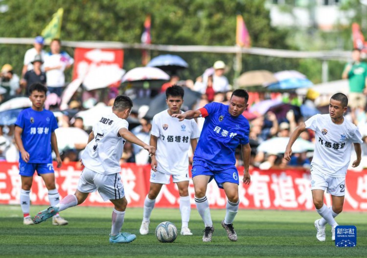7月15日,月寨村足球队球员李远攀(右二)在与六佰塘村足球队的比赛中拼抢。