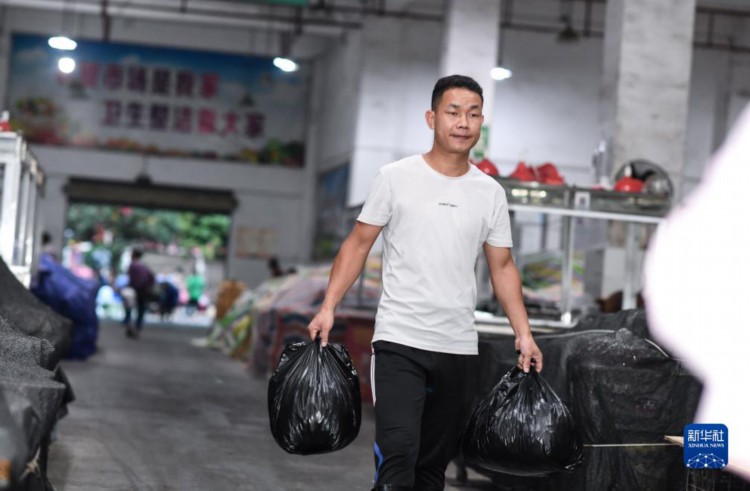 7月15日,丰乐村一队球员贾勇辉在农贸市场给客户分发豆芽。