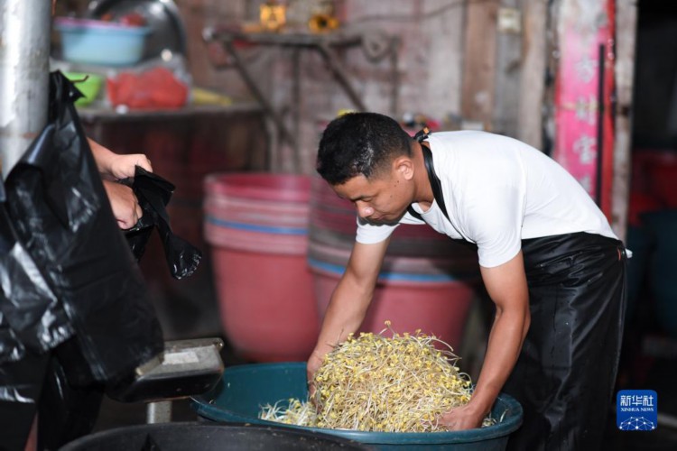 7月15日,丰乐村一队球员贾勇辉在豆芽生产作坊里给客户准备豆芽。