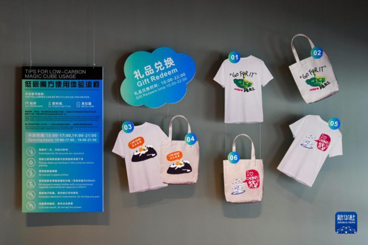 这是7月16日拍摄的“低碳魔方”使用体验流程信息牌及可参与兑换的礼品。