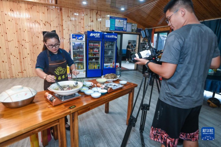 7月18日,在杭州富阳广吉生态农业基地内,新乡贤周小芳(左)正在进行电视专题片拍摄,推介当地特色美食。位于杭州市富阳区银湖街道坑西村的广吉生态农业基地是由回归的新乡贤创办,是一家集水产养殖、垂钓、餐饮、观光于一体的农文旅休闲产业基地。 近年来,浙江省杭州市富阳区银湖街道积极推动新乡贤助力乡村振兴工作,充分调动新乡贤的示范引领作用,广泛凝聚新乡贤力量,围绕产业发展、基层治理等实际需求,招引优秀人才,发展特色农旅产业,助力乡村振兴和共同富裕。 新华社记者 徐昱 摄