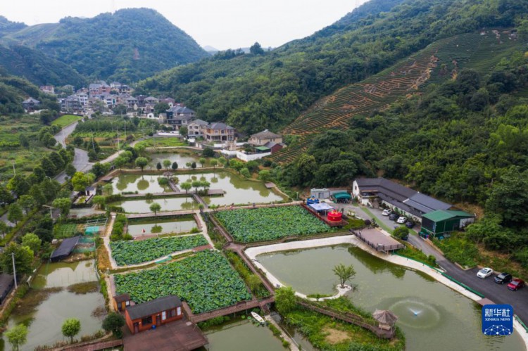 7月18日拍摄的杭州富阳广吉生态农业基地(无人机照片)。位于杭州市富阳区银湖街道坑西村的广吉生态农业基地是由回归的新乡贤创办,是一家集水产养殖、垂钓、餐饮、观光于一体的农文旅休闲产业基地。 近年来,浙江省杭州市富阳区银湖街道积极推动新乡贤助力乡村振兴工作,充分调动新乡贤的示范引领作用,广泛凝聚新乡贤力量,围绕产业发展、基层治理等实际需求,招引优秀人才,发展特色农旅产业,助力乡村振兴和共同富裕。 新华社记者 徐昱 摄