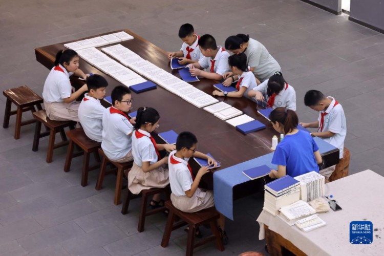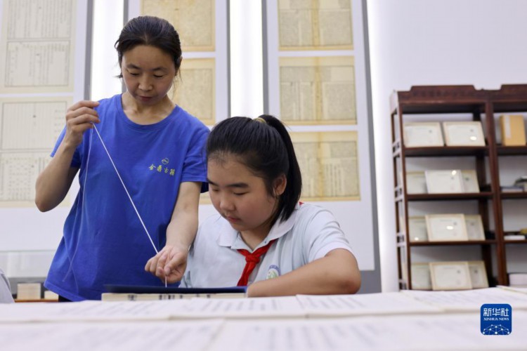 7月20日,在河北省沧州市吴桥县河北线装书博物馆,工作人员教吴桥县新华小学学生学习线装书制作技艺。 为丰富学生们暑期生活,河北省沧州市吴桥县开展了一系列暑期非遗研学体验活动,开放30余个非遗体验项目,让青少年面对面感受非遗魅力,促进非遗项目传承与发展。 新华社记者 骆学峰 摄