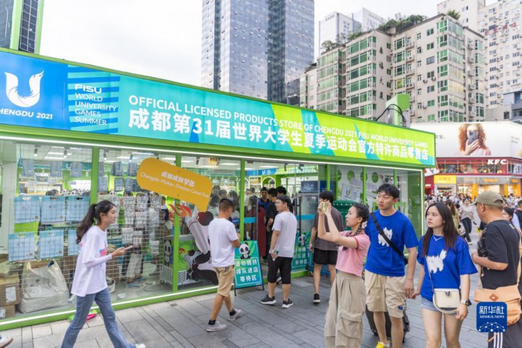 7月19日,在成都市春熙路步行街,人们在大运会官方特许商品零售店前驻足。