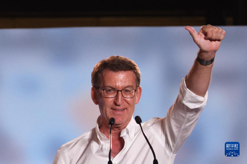 7月24日,在西班牙马德里,人民党主席阿尔韦托·努涅斯·费霍与支持者互动。新华社记者 孟鼎博 摄