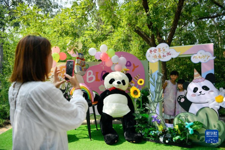 7月24日,在天津动物园熊猫馆,市民游客与大熊猫“喜乐”生日祝福装饰合影留念。