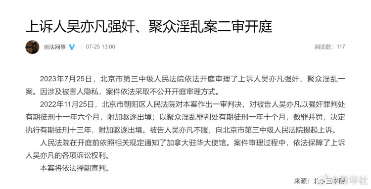 2023年7月25日,北京市第三中级人民法院依法开庭审理了上诉人吴亦凡强奸、聚众淫乱一案。因涉及被害人隐私,案件依法采取不公开开庭审理方式。