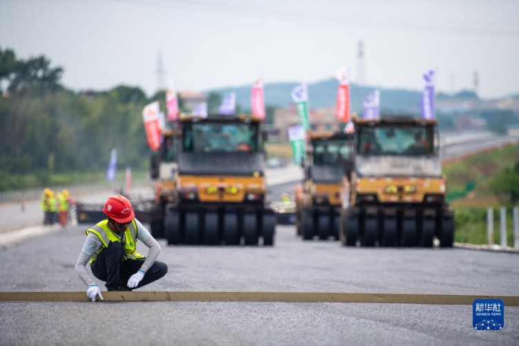7月25日,压路机在衡永高速路面工程施工作业。 近日,由湖南建投集团投资建设的衡永高速公路路面工程沥青摊铺施工全面展开。衡永高速是湖南“七纵九横”高速公路网规划的加密线,项目起于衡阳市蒸湘区雨母山镇,止于永州市冷水滩区北侧马坪村,线路全长106.227公里,全线采用双向四车道高速公路标准,设计行车时速120公里。 新华社记者陈思汗摄