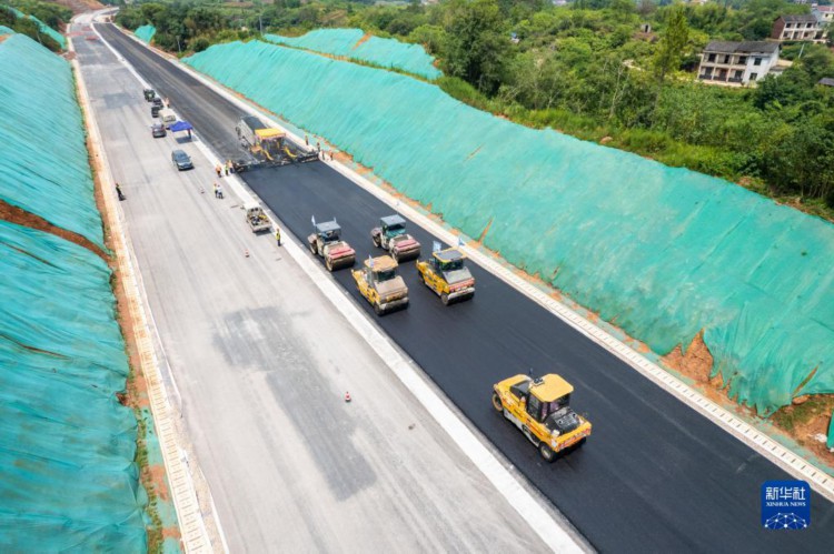 这是7月25日拍摄的衡永高速路面工程施工现场(无人机照片)。 近日,由湖南建投集团投资建设的衡永高速公路路面工程沥青摊铺施工全面展开。衡永高速是湖南“七纵九横”高速公路网规划的加密线,项目起于衡阳市蒸湘区雨母山镇,止于永州市冷水滩区北侧马坪村,线路全长106.227公里,全线采用双向四车道高速公路标准,设计行车时速120公里。 新华社记者陈思汗摄
