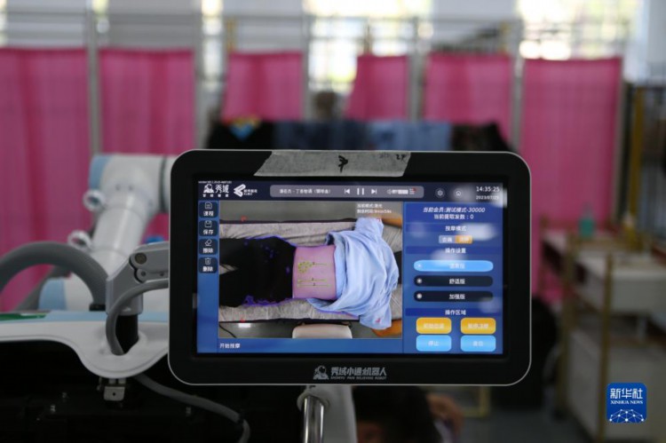 7月25日,在位于淄博市临淄区的遨博(山东)智能机器人有限公司,一名男士在体验该公司开发的康复理疗机器人。