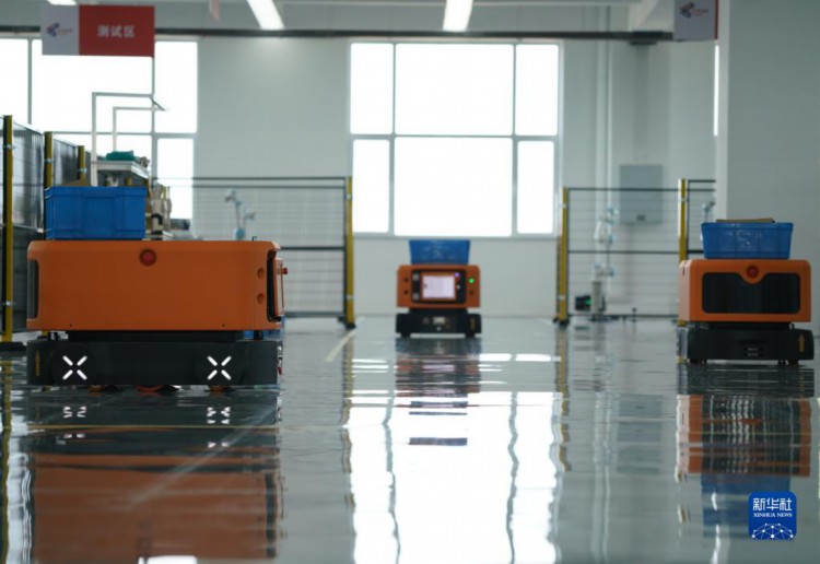 7月25日,在位于淄博市临淄区的遨博(山东)智能机器人有限公司,机器人在运送物品。