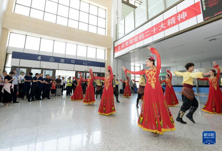 7月25日,首航航班落地后,乘客们在和田昆冈机场观看当地的民族歌舞。新华社记者 李贺 摄 |